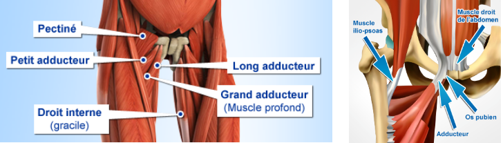 The pubic symphysis represents the place of insertion of adductor muscles. They form a triangle on the inner side of the thigh. Three zones or layers compose them :